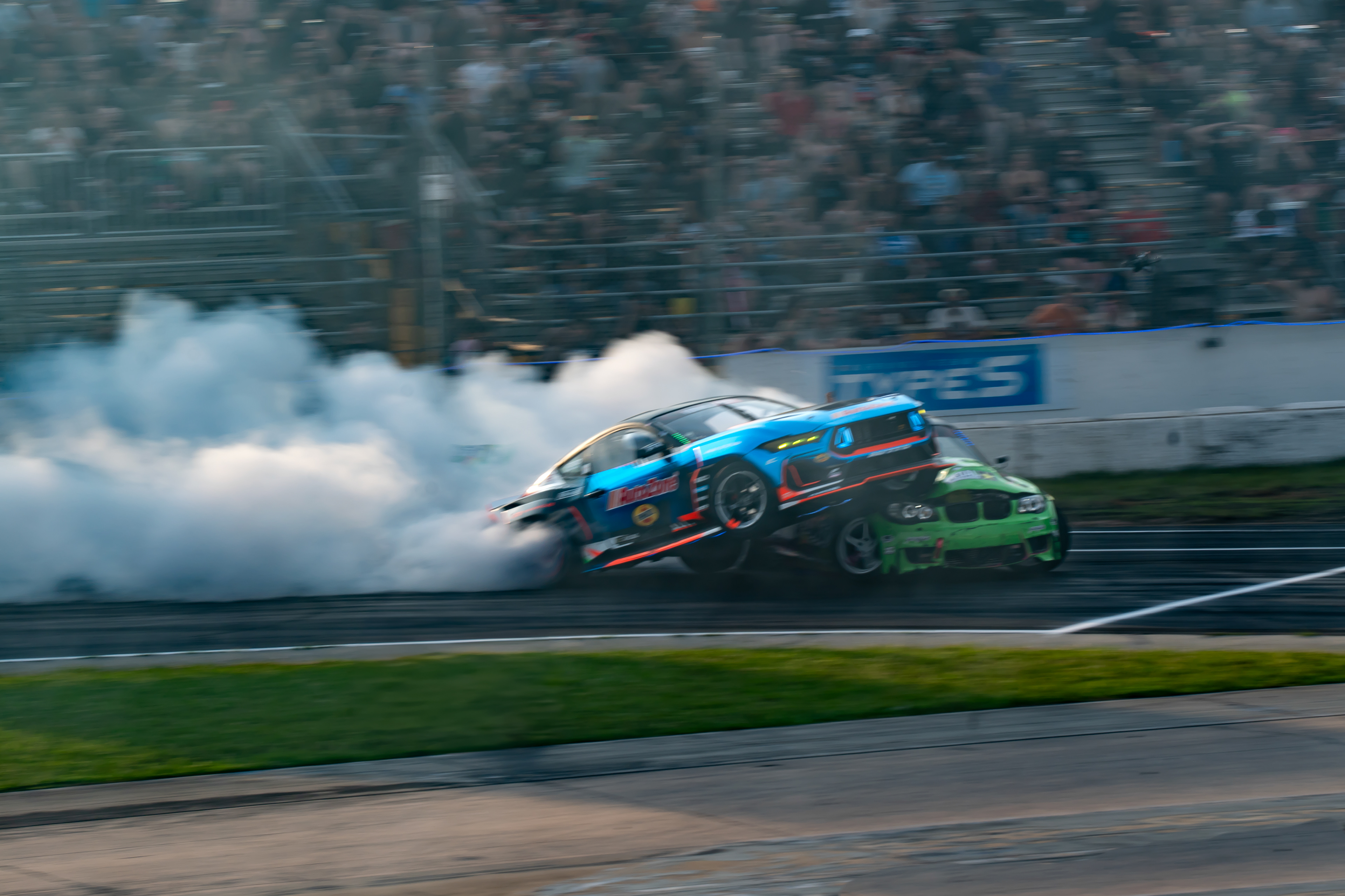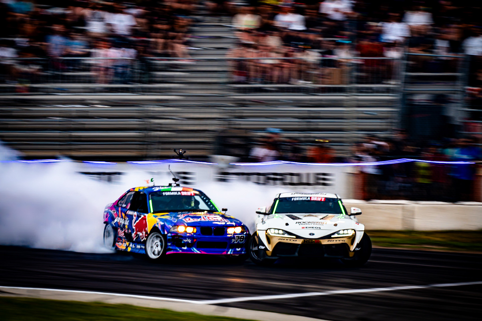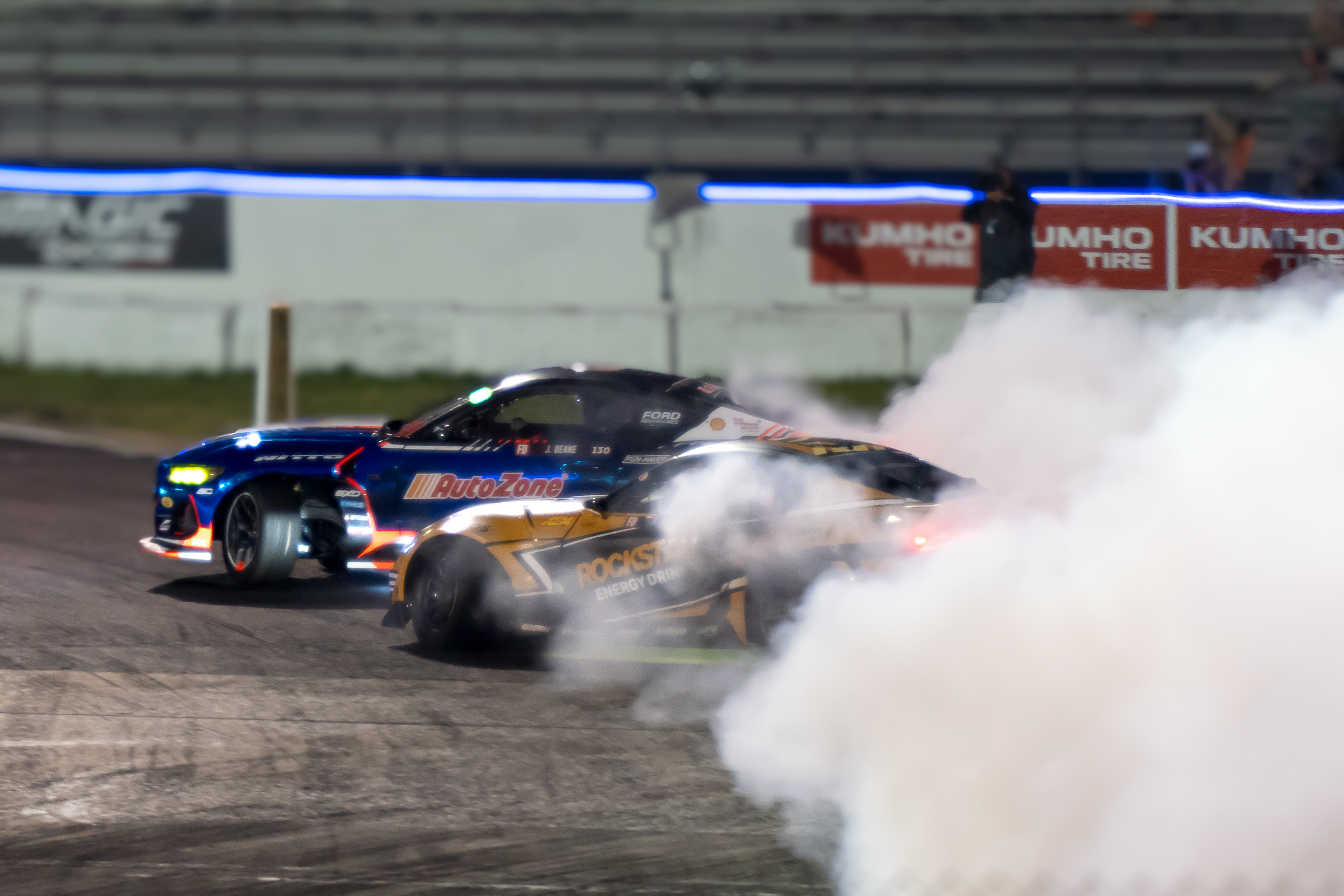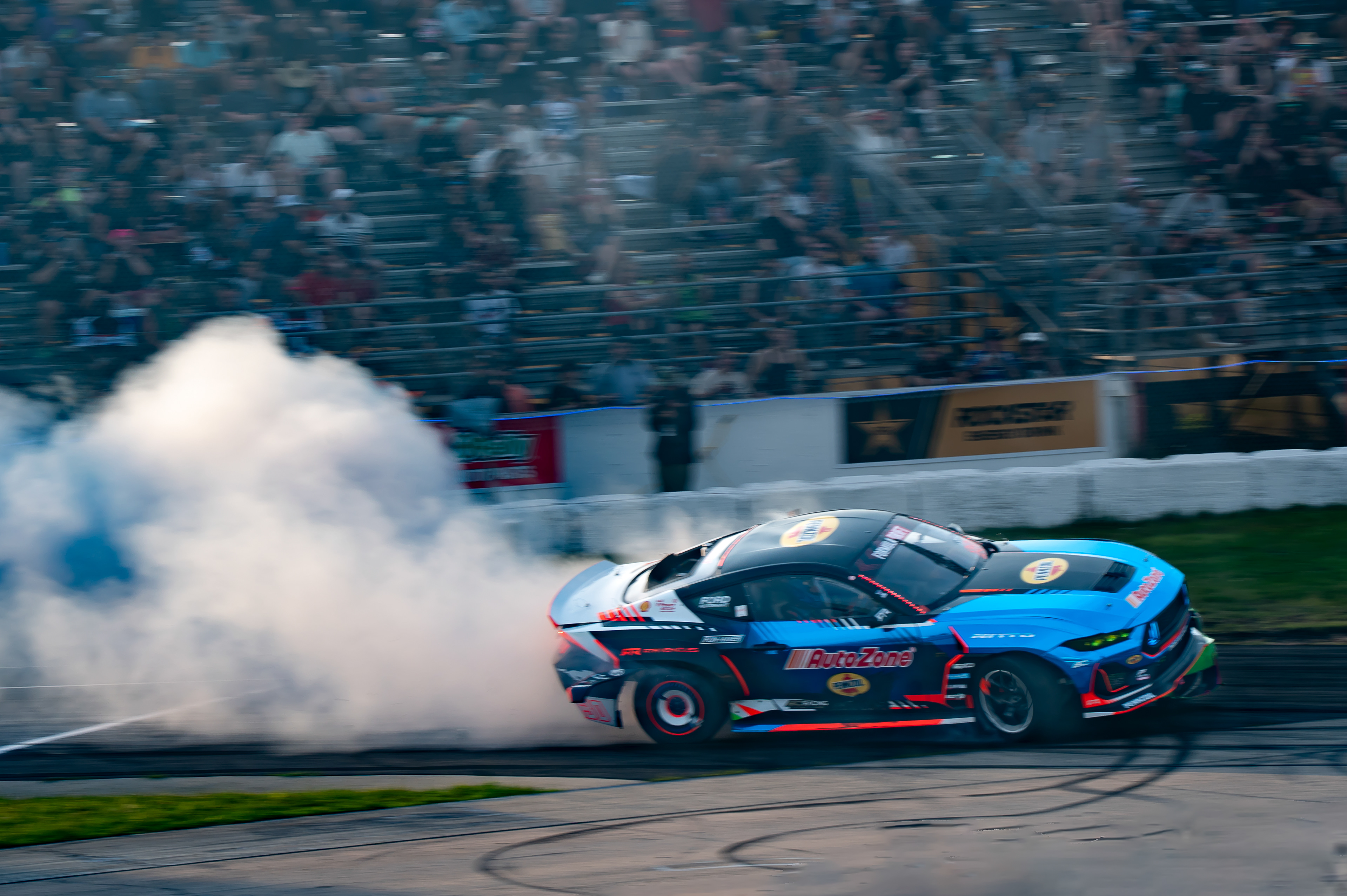 All of these were taken at Formula Drift New Jersey in the past few years. The first set is James Deane's epic car launch on top of Rome Charpentier in June 2025, taken with my 70-200mm at the top of the stands. Scroll through to see some of my favorites.