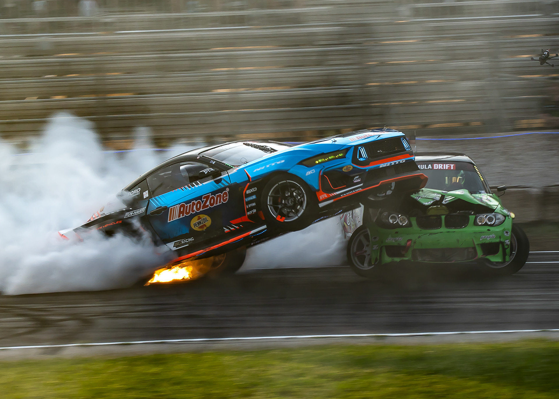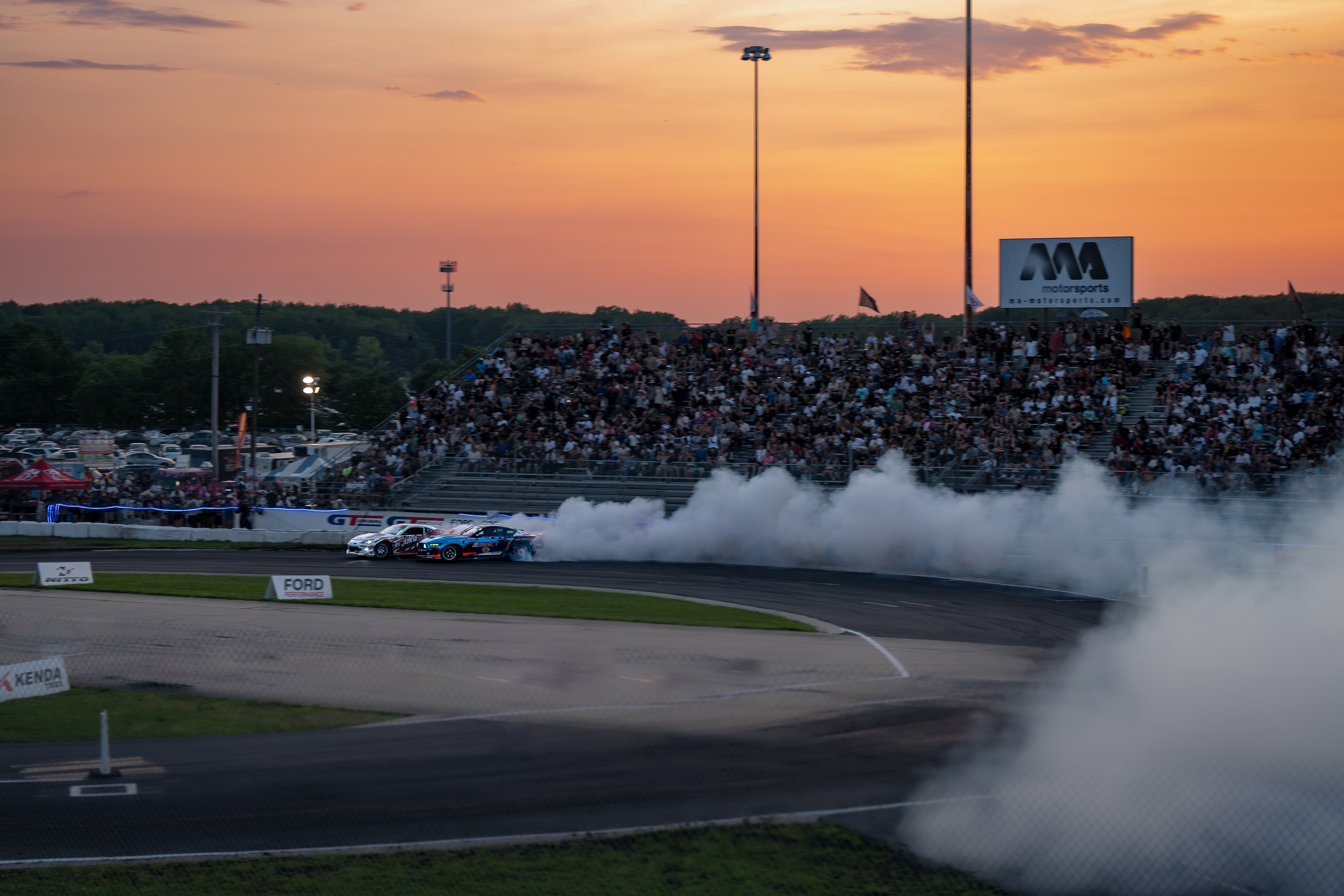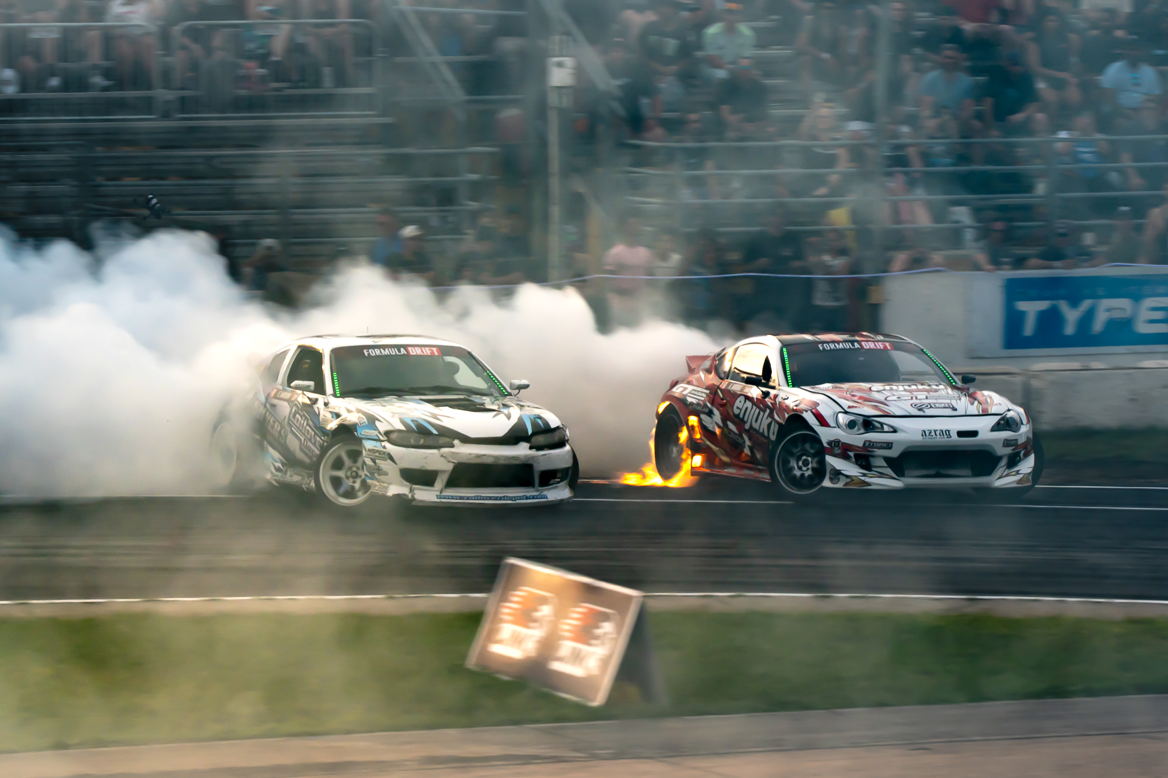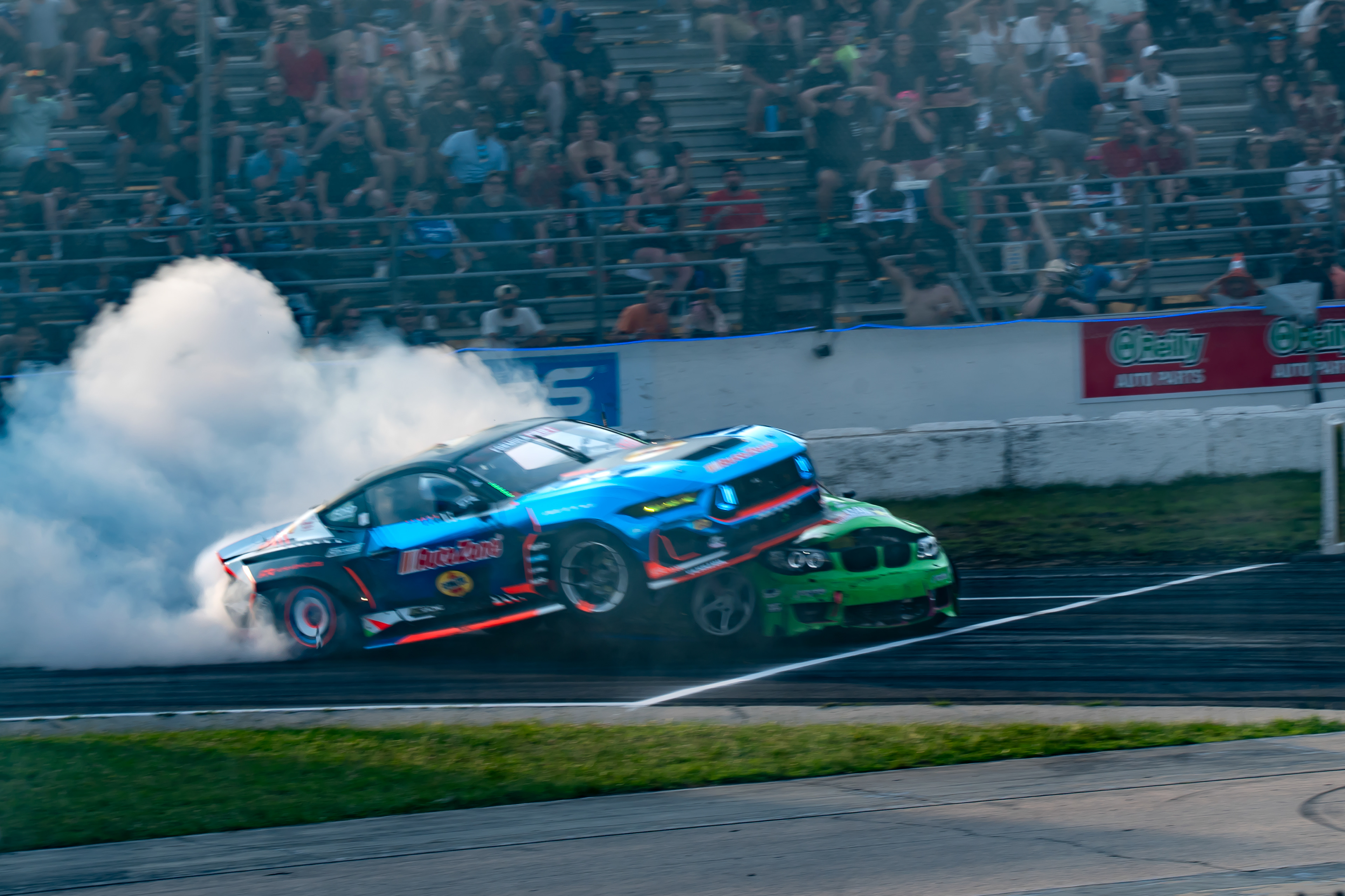 All of these were taken at Formula Drift New Jersey in the past few years. The first set is James Deane's epic car launch on top of Rome Charpentier in June 2025, taken with my 70-200mm at the top of the stands. Scroll through to see some of my favorites.