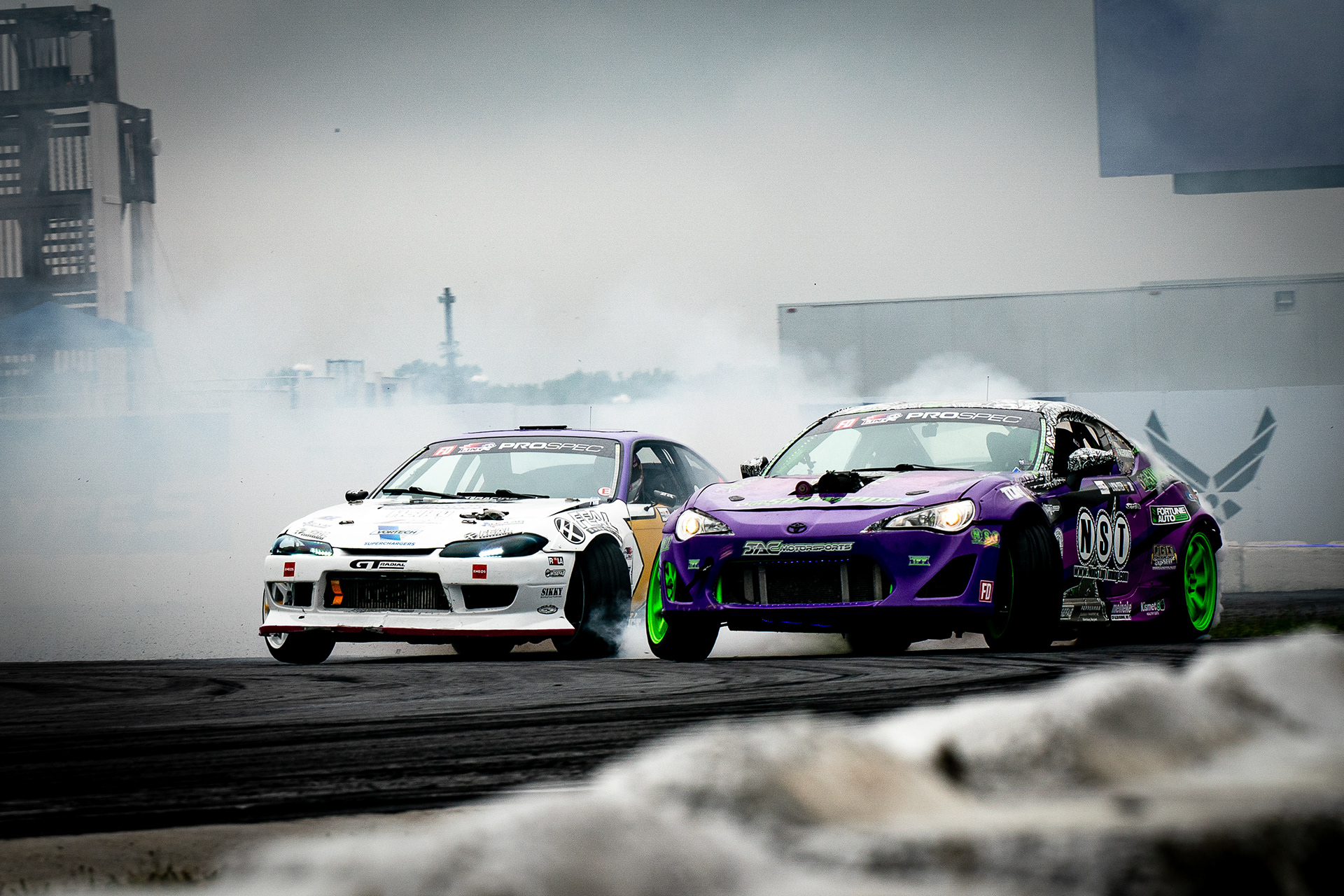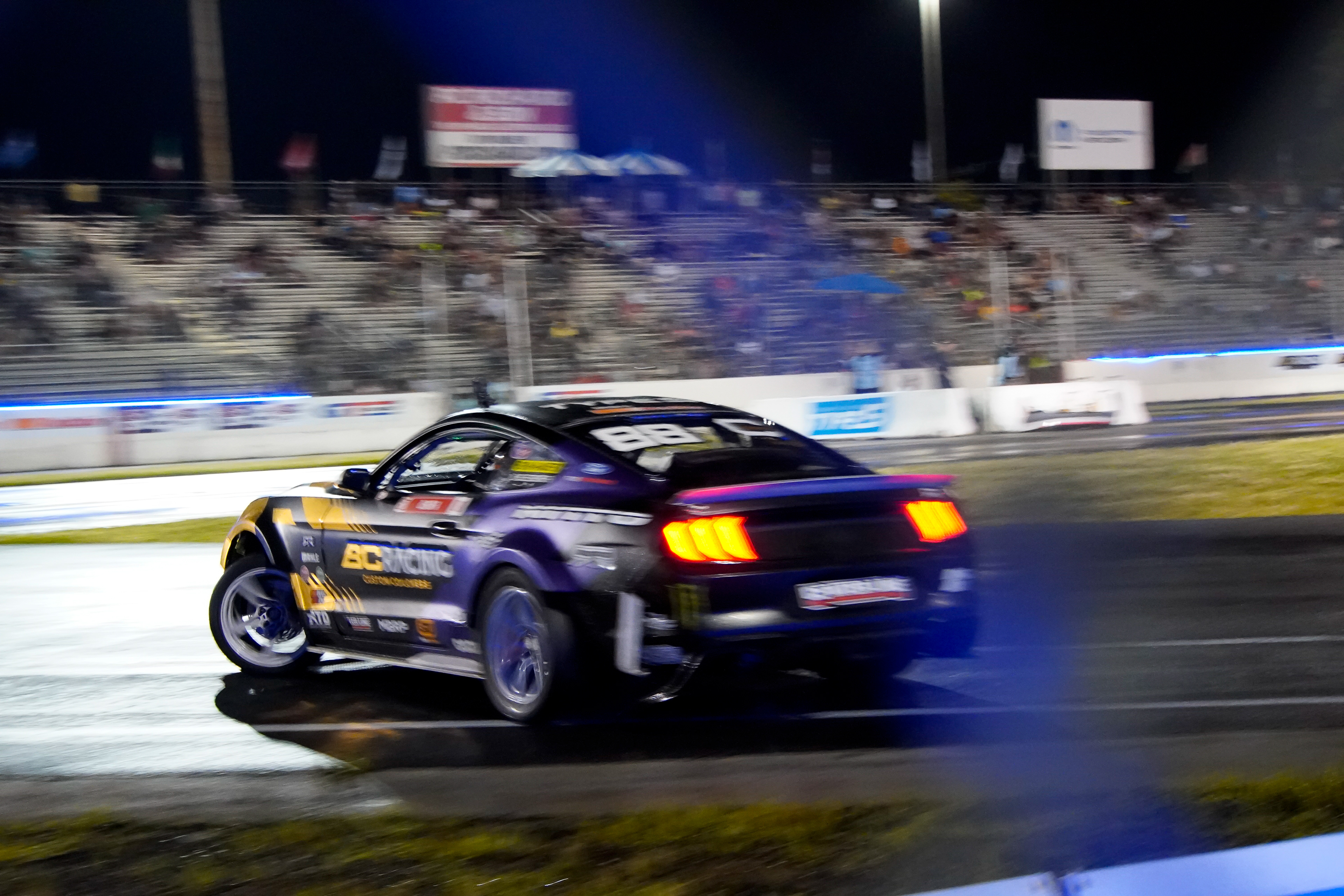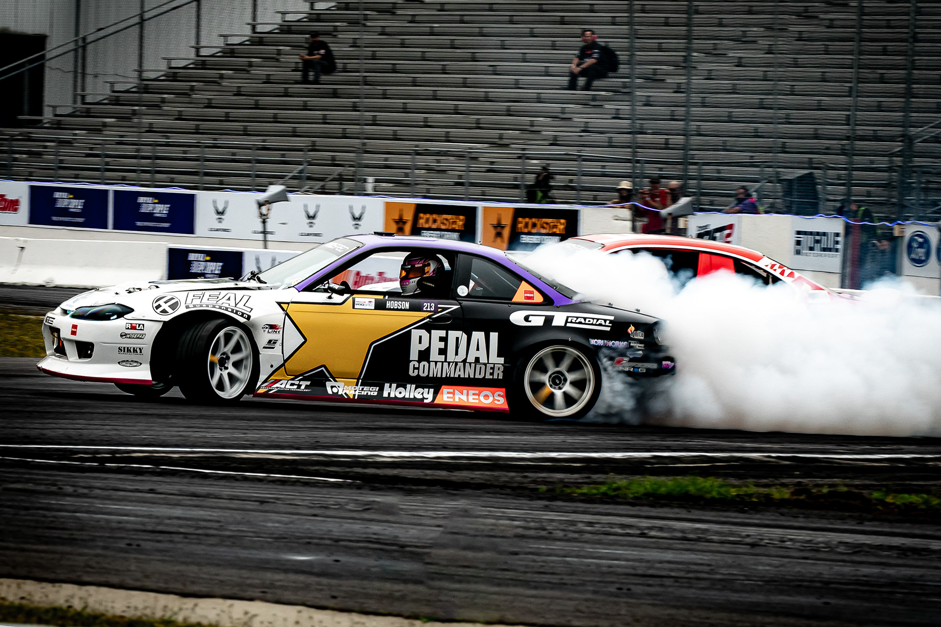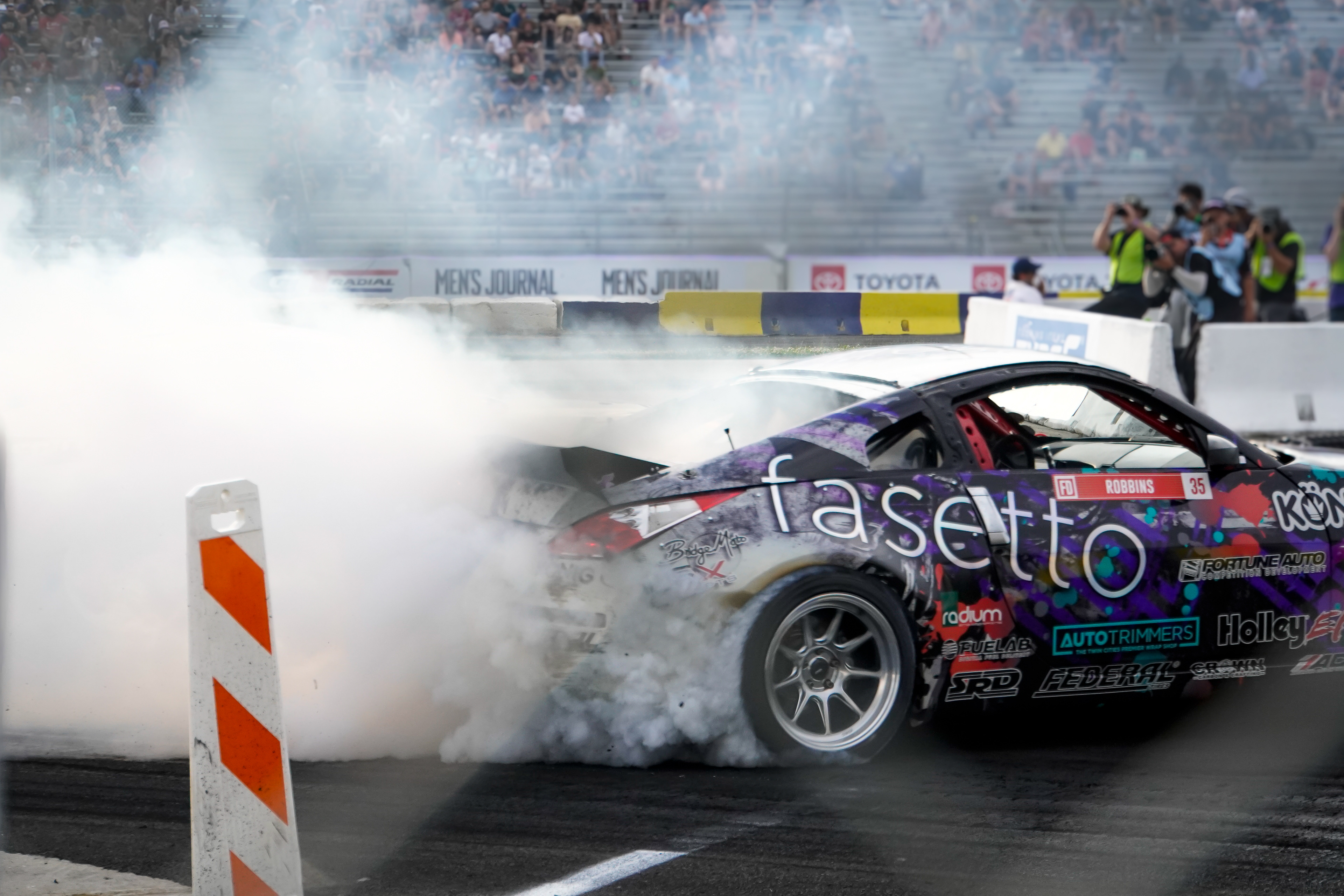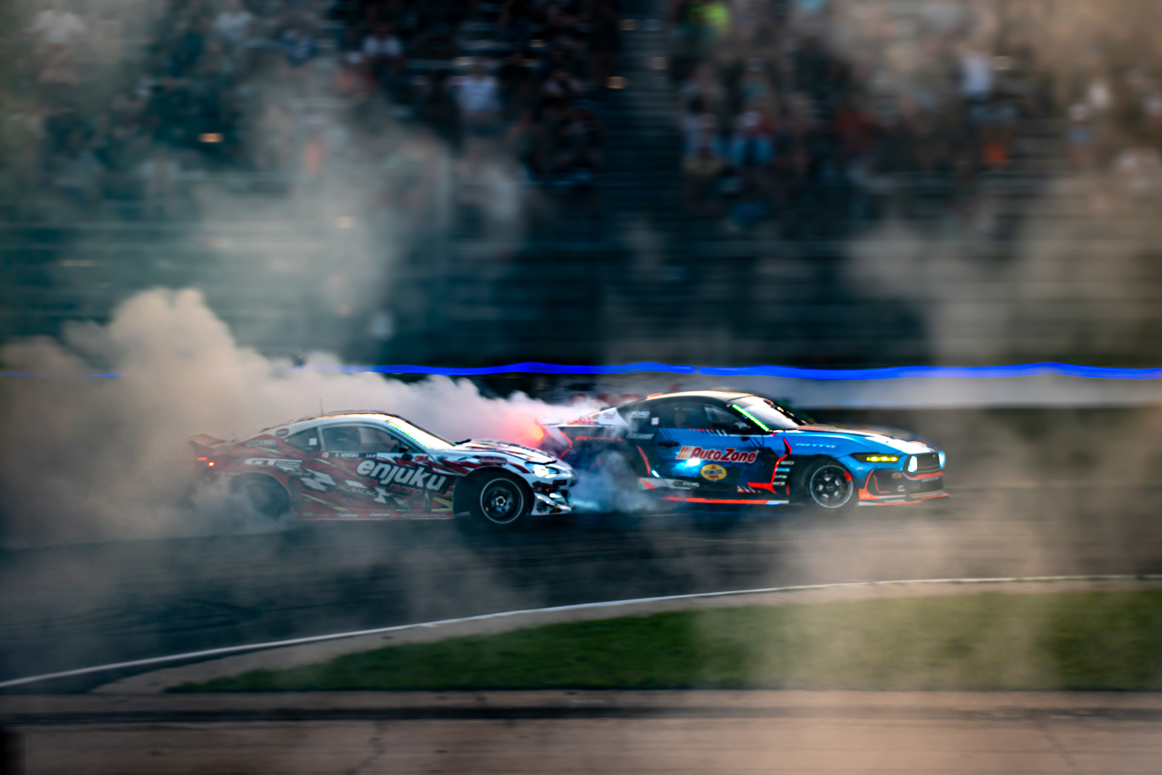 All of these were taken at Formula Drift New Jersey in the past few years. The first set is James Deane's epic car launch on top of Rome Charpentier in June 2025, taken with my 70-200mm at the top of the stands. Scroll through to see some of my favorites.